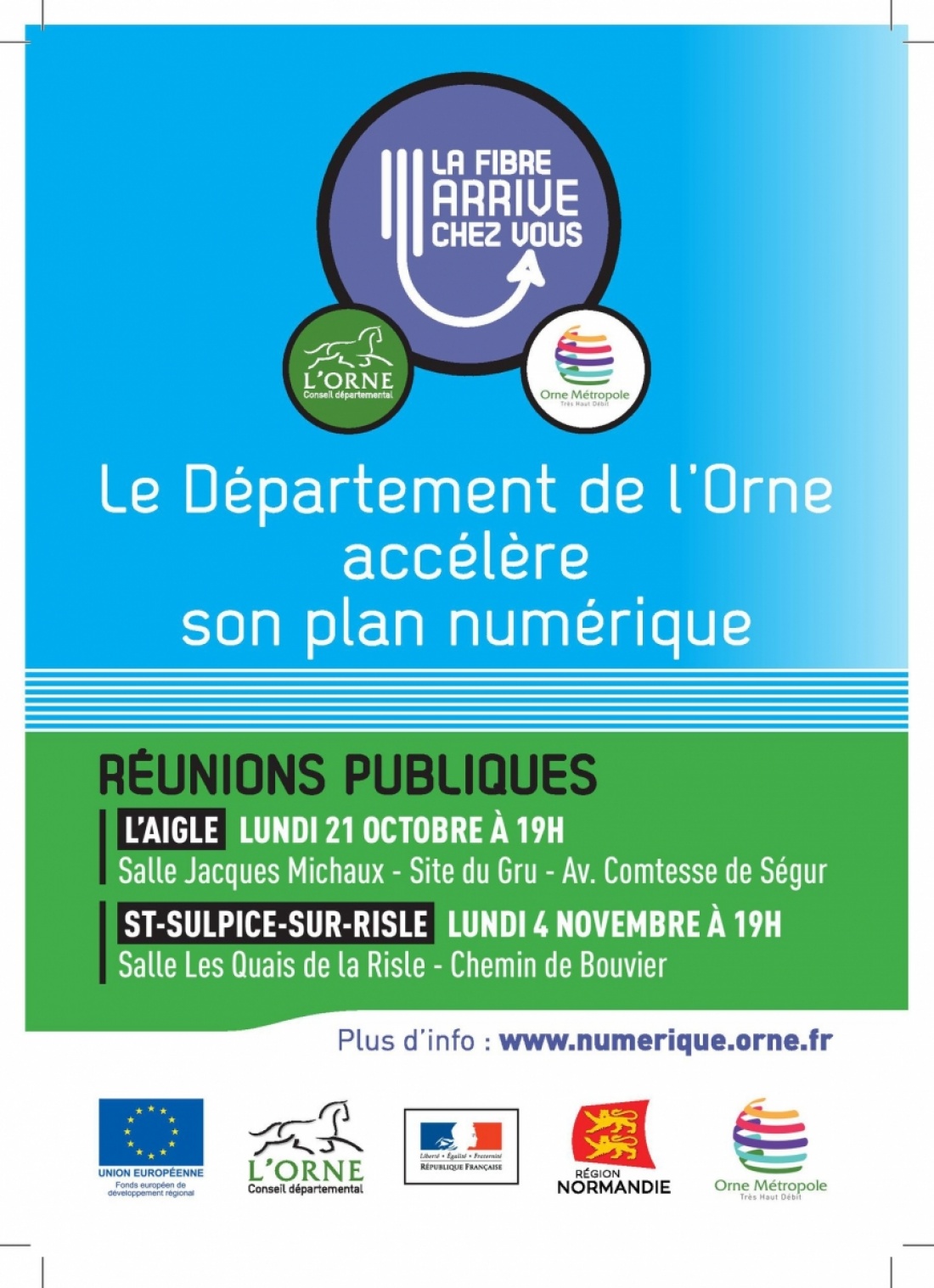 Orne Métropole Très Haut Débit, le Conseil Départemental de l’Orne et la Communauté de Communes du Pays de L'aigle organisent deux réunions publiques d'information sur le déploiement du réseau fibre.